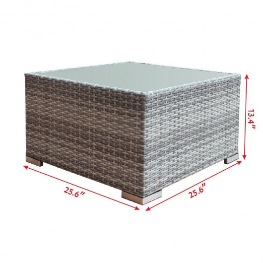 Specification: Color: Gray Material: Steel frame and rattan material Size of singe sofa: 29.5" x 29.5" x 25.6" (L x W x H) Size of armless sofa: 29.5" x 26.0" x 25.6" (L x W x H) Size of corner sofa: 29.5" x 29.5" x 25.6" (L x W x H) Size of coffee table: 25.6" x 25.6" x 14.5" (L x W x H) Thickness of seat cushion: 3.1"