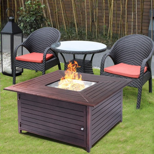 This aluminum propane gas fire pit is a perfect outdoor centerpiece to enjoy with family and friends. Constructed with weather resistant sturdy aluminum help for durability and long term use. On the table top there is a lid that can be taken off when the fire pit is in use and placed back on to become a center table. A stainless steel bowel is also provided to protect the fire pit from any rain. Textured dark brown color with a bronze finish adds style and elegance to your backyard. The burner has an adjustable heater and can burn at 40 000 BTU. Don't hesitate to buy it! High quality and brand new Constructed with weather resistant sturdy aluminum for durability and long term use Textured dark brown color with a bronze finish adds style and elegance to your backyard Fire pit contains a door that opens to store a 20lbs propane tank The burner has an adjustable heater and can burn at 40 000 BTU A stainless steel cover is also provided to protect the fire pit from any rain Assemble required