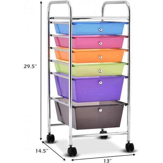 This 6 drawers rolling storage cart with 2 big drawers and 4 small drawers is ideal in your office home school and garage. This freestanding drawer cart features 6 plastic drawers with silver drawer pulls and durable sleek metal frame sitting on sturdy casters. Shallow deep drawers made from sturdy colorful clear plastic make all your items easily viewable while removable casters provide effortless mobility. Its multiple color scheme is sure to fit in with any decor. Keep it in your office for sorting files mail and other supplies. Store it in your kitchen for recipes gadgets and dish towels. Place this handy unit in your garage or workshop for organizing tools screws and other hardware. Great in a classroom for keeping arts and craft supplies in one easy place. You could even use it in a retail setting for sorting back stock items or paperwork. With so many options for this sturdy drawer trolley. This rolling storage cart is great for home and school use. Assembly is easy. Do not hesitate to buy one! Sturdy steel frame for long lasting performance Environmental wear-resisting and anti aging PP material ensures safe use Four movable casters for easy moving and relocation Two casters feature brakes to stop and fix it to where you want With silver drawer pulls it's flexible and easy to open the drawers Sturdy colorful clear plastic make all your items easily viewable Features 6 plastic drawers 2 deep drawers and 4 shallow drawers for classified storage Perfect for any room where space is limited