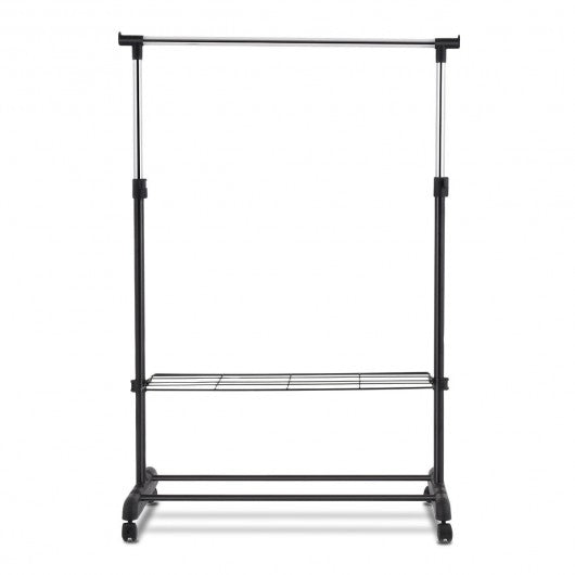 This clothes rack with not only single-bar and vertically-stretching stand but also a height-adjustable shoes shelf is excellent for indoor or outdoor use and will be your good helper. Constructed of heavy duty metal frame and the top-grade powder-coated steel this clothes and shoes rack can provide a long lifespan and create an effective drying space and sufficient storage to have your supplies in organized.The vertically-stretching design enables to hang clothes easily. Furthermore the tough pipe and solid structure offer better bearing capacity. The rack is equipped with a shoe shelf offering a more classified and organized storage. Buy yours today! Brand new and high quality Single-bar design with a height-adjustable shoes shelf Top-grade powder-coated steel and plastic offers better bearing capacity and a long lifespan Vertically-stretching design height-adjustable Casters for easy moving 2 of them feature brake and lock function Easy to set up and store This single-bar vertically-stretching stand clothes rack features a height-adjustable shoe shelf
