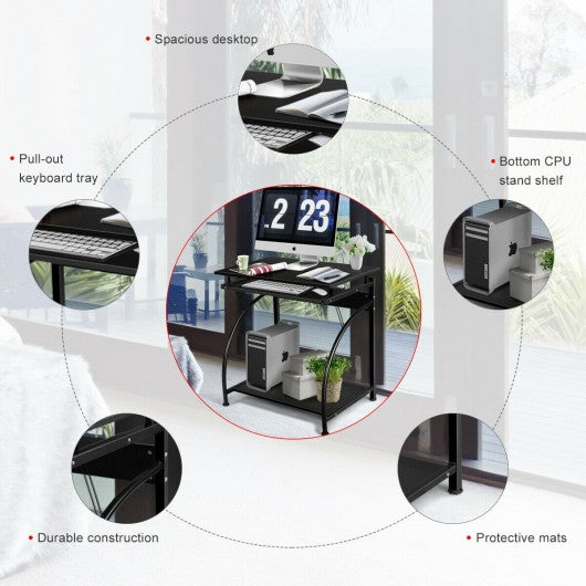 Specification: Color: Black Material: MDF + steel Overall size: 27.6" x 18.5" x 29.2" (L x W x H) Keyboard size: 23.2" x 9.4" (L x W) Bottom shelf size: 25.2" x 15.0" (L x W) Height form floor to bottom shelf: 2.8" Package includes: 1 x computer desk