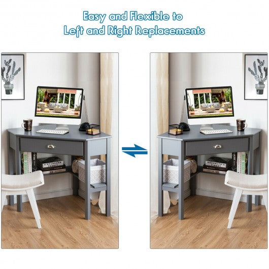 This is a corner computer desk which combines elegant appearance and various functions in one. The corner table is considerately designed with a large drawer and two wide shelves to offer you plenty of room for computer laptop table lamp book and other items. Unique corner table improves the space utilization while also making your room more tidy and orderly. Simple lines and generous color make the table be integrated into multiple different decorative styles perfectly. Solid pine wood structure ensures the firmness of the table so that it will serve you many years. Come and buy the corner writing table quickly and I believe it's a great choice whether at home or in the office! A drawer and two shelves offer ample storage space Corner table takes up less space takes full advantage of interior space Solid pine wood structure ensures durability and a large weight capacity Spacious smooth tabletop made of P2 grade board eco-friendly and easy to clean Simple and modern style table adds elegance and generosity to the room Drawer equipped with a handle easily take things out and close Footpads prevent the floor from scratching effectively It can be used as a computer desk writing table workstation office desk etc. Suitable for study office dorm bedroom and so on Lightweight desk for effortless movement Easy assembly required