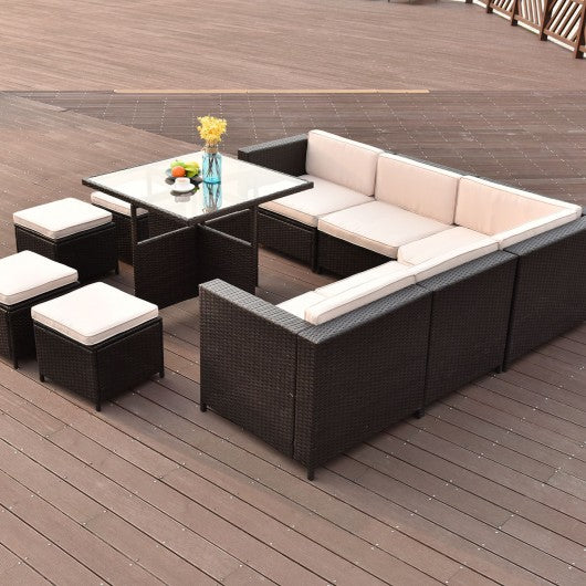 This 10 pieces rattan furniture set includes 1 corner sofa 2 single armrest sofas 2 armless sofas 4 ottomans and 1 coffee table which will be a great addition to your patio or garden. Totally providing 9 comfortable cushioned seats the rattan furniture set is perfect for family or friends having a happy dining in the outdoor living space. The furniture have solid steel frame that is durable and can serve you long-term use. The unique coffee table has a tempered glass table top to add more fashion. The seats all come with cushions with a removable cover for easy cleaning. The rattan sofa and table set is perfect for the pool side deck or patio these cushioned seats will let you and your guests to sit back relax and enjoy the great outdoors. High quality and brand new Solid durable steel frame Totally providing 9 seats for friends and family Seats with comfortable cushions Cushion with a removable cover for convenient cleaning Ideal for patio porch poolside or garden Assembly required and all the hardware included