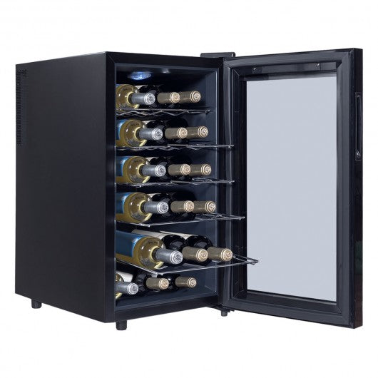 This is the professional 18 bottles thermoelectric wine cooler which is perfect for storing your favorite wine bottles in a dependable climate-controlled space. Made with compactness and energy efficiency in mind this wine cooler is equipped with a sleek black cabinet and a glass see-through door. It can be used in a small apartment kitchen home bar entertainment or dining area. The thermoelectric technology allows you to easily serve your friends family and guests with this cooler whenever you like. If you are looking for a cooler like that don't hesitate to add it to your cart! Brand new and high quality Maintains the perfect temperature for wines Compact and low energy consumption Efficient thermoelectric cooling Electronic touchpad for LED temperature controlling and displaying Glass see-though door Low noise low vibration Removable steel shelves provide a sturdy and solid holder and is easy to clean Temperature can be set between 12 ℃ to 18 ℃ Hold up to 18 standard size wine bottles Interior light can be turned on to showcase contents Perfect for kitchen bar or dining room use