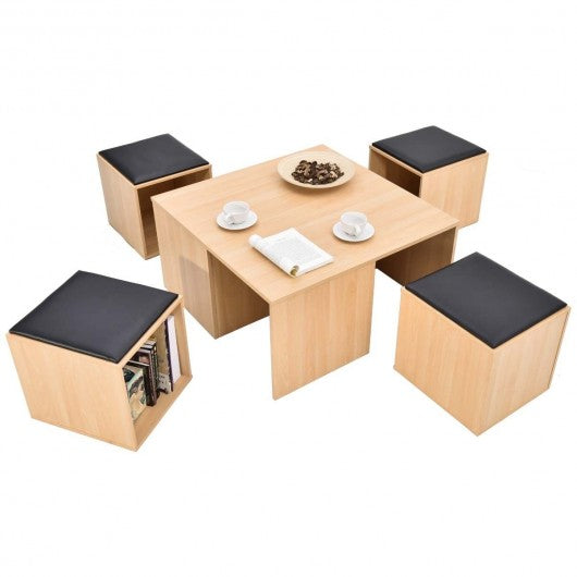 5 pcs Wood Living Room Table Set with 4 Storage Ottoman Stool