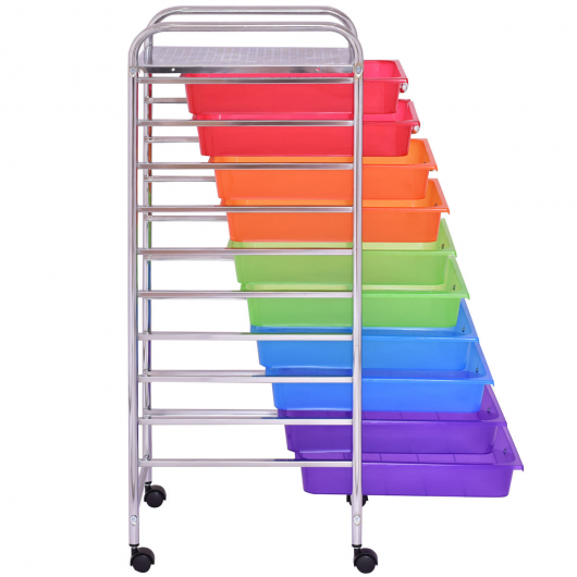 This rolling storage trolley cart with 10 drawers offers a stylish solution for organizing and storing your items easily. This is a brand new 10- drawers Rolling Storage trolley cart which offers astylish solution for organizing and storing your items easily. This versatilecart is constructed from a sturdy chrome plated steel frame and includes 10sliding drawers and 4 black casters for added mobility. What's more it has twogrip handles for convenient handling. In addition the metal panel on the topcan put things and have a good protection of the drawers. The metal panel on the top can be used to put and display things and better protects the drawers. Don't hesitate to buy it now! Brand new and high quality 10 stylish colored plastic sliding drawers in a metal frame 2 easy-grip handles With four 360 degrees swivel wheels can move smoothly Sturdy steel frame adds its stability and durability With a metal panel on the top Good for storage Easy to clean Assembly required