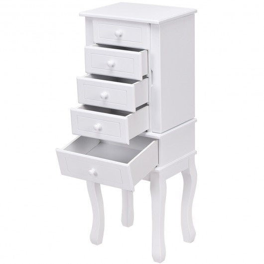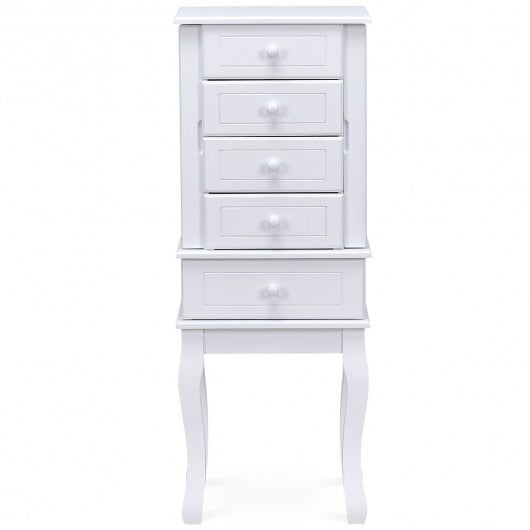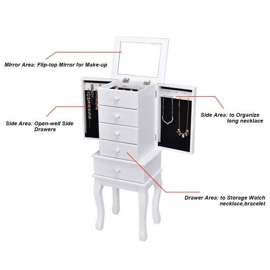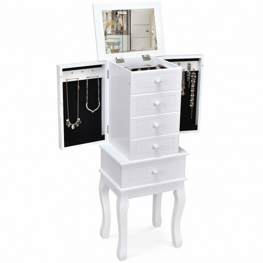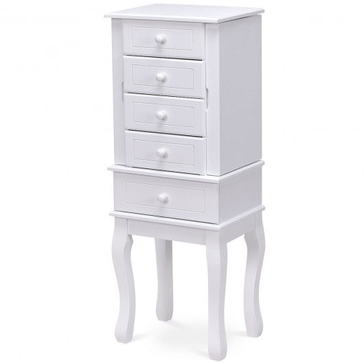 This is newly designed jewelry cabinet with mirror on top which serves as a perfect example for large storage capacity. The 5 drawers save you a large space for your favorite accessories such as bracelets glasses ties scarves watches perfumes while the interior hooks on the side doors prevent your necklaces and chains from tangling and fold in to form a sleek uniform front. You can save your favorite accessories safely and in an organized manner and dressing mirror and jewelry cabinet cleverly combines is convenient and practical it makes it easy to choose your jewelry in the morning without the frustration of looking for missing pieces. If you are looking for a jewelry cabinet don�t hesitate to buy it! High quality and brand new Features solid MDF body and wood leg is durable and sturdy Professional divide: Top compartment features ring/ear studs roll watch/bracelet grids other 5 drawers for necklace earring cosmetics etc Five drawers and two side doors provide powerful storage capacity Dressing mirror and jewelry cabinet cleverly combines is convenient and practical Nicely designed shape with 4 strong feet on bottom Suitable for all types of jewelries Assembly required
