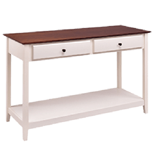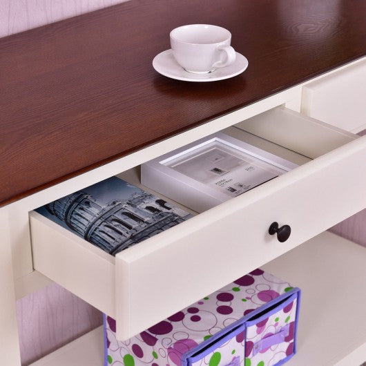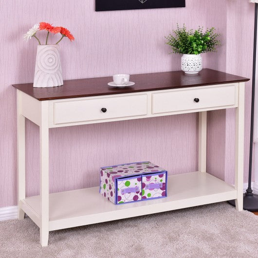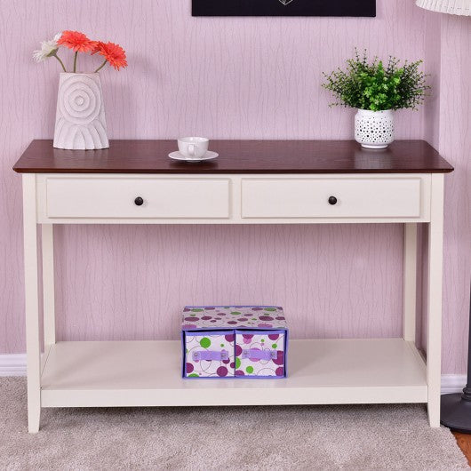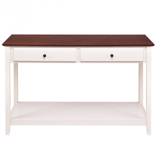 This high-quality console table is designed with cottage appeal. This writing desk is sure to create a wonderful accent among your decor. The two deep drawers are accessible from the front of the desk with color matched knobs. The combination of a clean white finish with nut-brown creates a blend of whimsical charm and country chic style. The table is finished on all four sides. Slim design offers 2 drawers for convenient storage and durable hardwood. Add this delightful console desk to your home for convenience and class. Don't hesitate to buy it! Brand new and high quality Simple and modern design Durable and stable wood structure Painted finish moisture proof and moth proof Clean creamy finish with nut-brown full of contemporary style Two slide-out drawers and a bottom shelf for additional storage Convenient size desk for any room of the house Charming with details Easy to clean and assemble