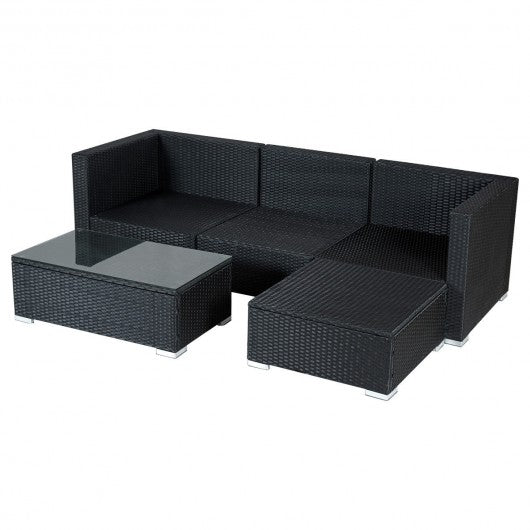 This is 5 pieces rattan furniture set includes 1 armless sofa 2 corner sofa 1 footstool sofa and 1 coffee table. It will be a great additional to your outdoor living space. The sofa set adopts the durable steel construction which is very sturdy and stable. So you can use it for a long time. The thick sponge cushion gives you a comfortable seating experience. This contemporary furniture set offers exceptionally comfortable outdoor lounging. You can enjoy the great weather and relax in the lounge with it. It is perfect for patio garden deck backyard pool side and other outdoor living space. Don't hesitate to buy it now! Including 1 armless chairs 2 corner sofa 1 footstool sofa and 1 coffee table Constructed of high quality rattan material offering long lasting durability Perfect for patio garden deck backyard pool side and other outdoor living space The table features top glass is for superior strength Breathable seat cushions add comfort and removable cushion covers are easy to rinse Thick sponge cushion gives you a comfortable seating experience Assembly required