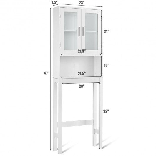 This versatile bathroom spacesaver allows you to utilize extra space for all your bathroom storage needs. Place this white bathroom space saver around the toilet and add bathroom storage space quickly and easily. Features an two-door cabinet and an open shelf for easy access storage. The cabinet provides excellent storage solutions for bathrooms with limited space. This bathroom space saver features sturdy MDF construction and its white finish ensures that it will match and accent any existing decor. It is a free standing furniture piece which conveniently fits over standard toilet tanks and adds easy storage for roll paper and other bathroom necessities. If you are looking for the bathroom spacesaver don't hesitate to buy it! Warning:Toilet Rack with frosted or clear glass are shipped randromly Brand new and high quality Elegant and sleek storage cabinet Charm and practicality come together in perfect harmony Premium MDF construction adds its durability and stability Finished in a refreshing and bright white color Allows you to utilize extra space for all your bathroom storage needs Includes a open shelf and one two-door cabinet Hidden area behind cabinet doors features two storage shelves Feature handles for easy opening and closing Fits over most standard toilets Provide excellent storage solutions for bathrooms with limited space With a wipe-clean surface easy to clean Assembly required