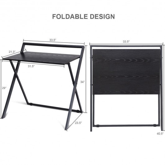Specification: Color: Black Material: Particleboard + steel Overall size: 33.5" x 23.5" x 34" (L x W x H) Workstation dimension: 31.5" x 21.3" x 29.0" (L x W x H) Folding size: 33.5" x 40.5" (L x W) Net weight: About 20 lbs Package includes: 1 x Computer desk