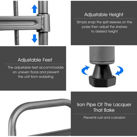 Whether you are selecting storage for your kitchen or somewhere else this rack will meet your demands perfectly. Compact yet multifunctional design endows its excellent performance to fit in the kitchen home office and living room which can help you organize different kinds of items on the 4 tier shelves from microwave to spice from shoes boxed to books. Thanks for its reinforced metal frame each shelf can bear up to 55lbs and thicken pipes connecting with shelves can enhance stability and provide added support. Furthermore rust-resistant as well as smooth outer varnish will promise long-lasting shiny gloss to serve you for a long time and enable you to clean its surface easily. Last but not least leveling feet at bottom is able to fit uneven ground and humanized handle on the top is supposed to assist you when moving this rack. This microwave rack will be a great helper for you don't hesitate to buy it! The 4-Tier shelf is multifunctional to store microwave dishes kitchen appliances and something else The floor-standing rack provides ample storage enhances the utilization of space and occupies less area Iron frame construction is sturdy heavy-duty and durable Each open-wire shelf with dustproof function can bear up to 55 lbs Rust-resistant outer varnish ensures long-lasting gloss and service time Smooth surface is easy to clean and keep tidy Adjustable feet can not only protect the floor but also reinforce stability Ergonomic handle and lightweight design for easy movement Suitable for living room home office entryway etc