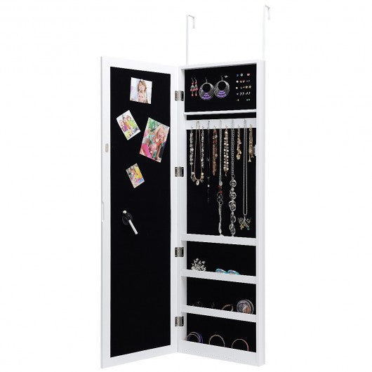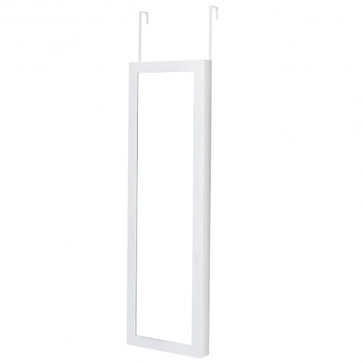 This is latest jewelry cabinet with full size magnetic mirror that is specially designed for all your valuables. It helps your jewelry in an organized manner and prevents them from getting tangled and keeps your jewelry safe and away from kids. The mirror is magnetic and comes with four magnets a pen and a pen holder so that you can put some of your favorite photos or pictures on the mirror or inside the door. Full size mirror is convenient for you to try your clothes or jewelry on. In addition its chic and stylish design fits with your bedroom decor. With it your life will be convenient and self-consistent. Worth having! Brand new and high quality Made of premium MDF board durable and stable Painting coated moisture and corrosion resistant Oxidation resisting velvet liner prevents your jewelries from being scuffed and scratched 7 lines for finger ring or earring 11 hooks 4 storage racks Full size mirror is convenient for you to try your clothes or jewelry on Magnetic design makes it more charming Helps your jewelry in an organized manner and prevents them from getting tangled Door or wall mounted for saving more space Fits with you bedroom decor Easy to assemble and clean