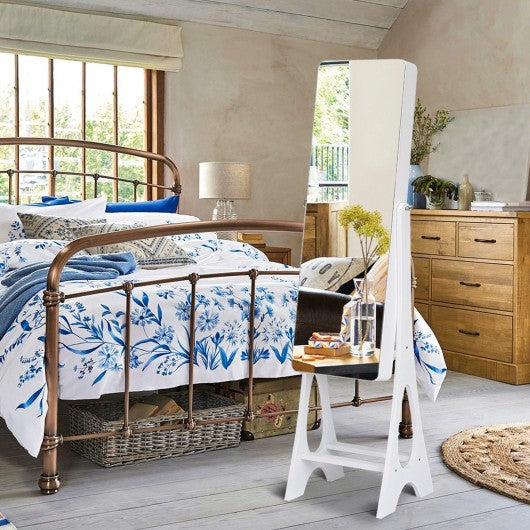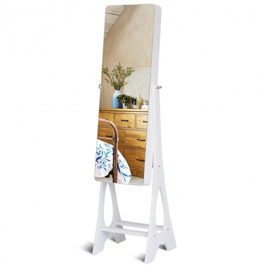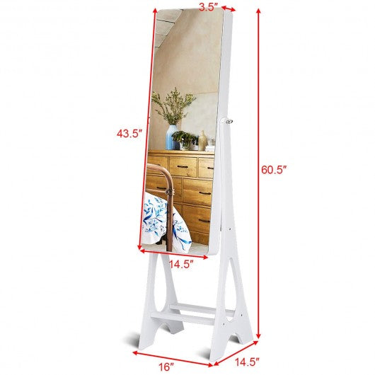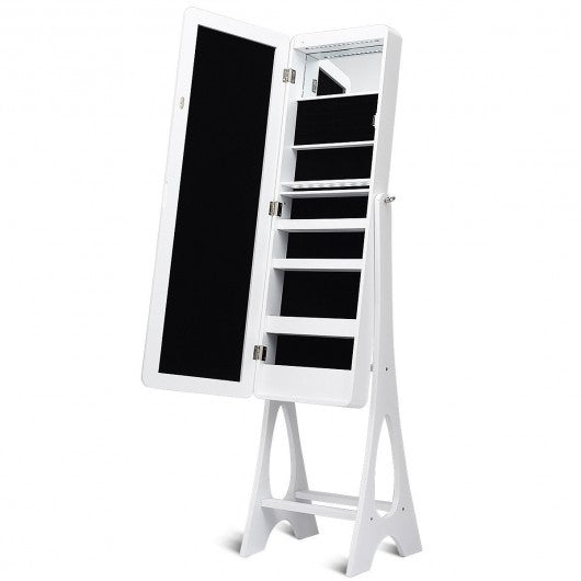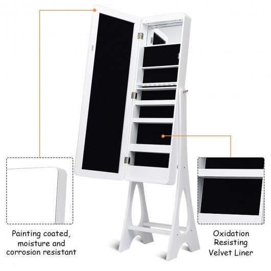 The jewelry cabinet with full size mirror and LED lights is an attractive artwork. It is specially designed for all your valuables. It helps your jewelry in an organized manner and prevents them from getting tangled. It keeps your jewelry safe and away from kids. Full size mirror is convenient for you to try your clothes or jewelry on. In addition its stylish design fits with your bedroom decoration. With it your life will be convenient and self-consistent. If you are looking for a jewelry cabinet don't hesitate to buy it. Brand new and high quality Made of premium MDF board durable and stable Painting coated moisture and corrosion resistant Oxidation resisting velvet liner prevents your jewelries from being scuffed and scratched 60 ring slots 16 lipstick slots 1make-up mirror and 4 shelves With full size mirror is convenient for you to try your clothes or jewelry on Helps your jewelry in an organized manner and prevents them from getting tangled Features beautiful LED lights make your jewelry more dazzling 3 angle tilting positions for choosing your favorite angle Fits with you bedroom decoration Easy to assemble and easy to clean