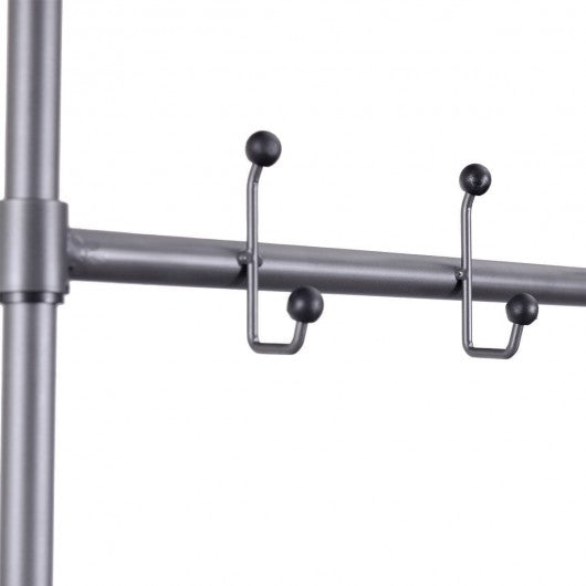 This is an entryway coat shoe storage rack featuring powder-coated steel frame. It is designed of three tiers shoes racks and two tiers bag shelfs and one coat rack. Thanks to its free standing design this coat hanger is able to satisfy your demands of reducing space occupation. This compact entryway organizer features 3- tier shelves at the bottom to store up your shoes. Meanwhile a bag shelf gives more convenience for you to put bags purses or backpacks once you walk in the door. The 8 stable hooks can keep your coats hats or handbags neat. Don't hesitate to buy it! Brand new and high quality Smart storage and organization Space saving Tidy up the clutter Steel construction with powder coating more durable more sturdy and load-bearing better Three tiers shoes rack and two tiers bag shelf and coat rack 16 hooks protect your clothes and hats carefully can store clothes hats umbrellas bags shoes and etc. With 4 adjustable feet the coat stand can stay perfectly stable on carpets or uneven floors The arched side frame features rounded corners and matte finish showing a unique and stylish look Perfect for your entryway bedroom office living room Easy to assemble and easy to clean