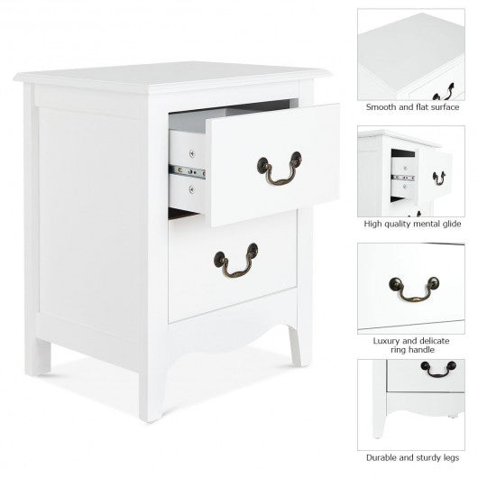This is the elegant and classic sleek designed nightstand which can provide large storage space for its two spacious drawers. It is designed as a compact and convenient nightstand. it also features sleek metal handles and the smoothly running metal glides with safety stops on the drawer for easy to open and close the drawer which provides more practicability. It is painted white finish that can fits almost any bedroom. With its superior quality and spacious capacity it can serve you for years and your room will be added with beauty and elegance. If you are looking for a nightstand like that. Don't hesitate to buy it. Brand new and high quality Made of premium particle board and e1 MDF durable and solid Coated with professional mdf paint in pure white finish easy to clean Pro-environmental and no-pollution material provide healthy living atmosphere Features 2 separating drawers for ample storage space to keeps items orderly and organized Elegant knob on the drawer for easy to open and close the drawer practical and functional Smoothly and quietly running metal glides Proper size for offices parlors bedrooms and bookrooms as console table coffee table bedside table Simple while stylish design is compatible with any decor of your room Simple design easy to assemble under the manual enclosed