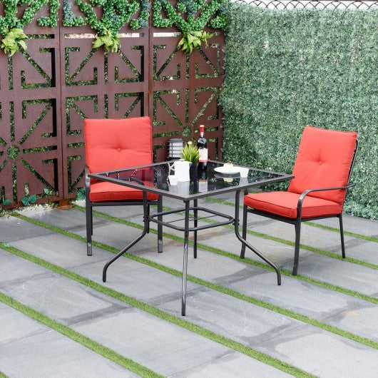 This is a 3 pieces outdoor dining set which is perfect to decor your patio yard and offers you and your guests a comfortable seating experience. The industrial powder-coated iron frame makes the stool rugged corrosion-resistant and provides you years of durable use. Comes with seat & back cushions this chair holds an elegant form with no cost to comfort. Comfort as the goal the armrest and back are designed base on the principle of ergonomics. The tabletop is made using smoke grey glass has a hole for an umbrella and along with the chairs is finished in a matte espresso finish. This set brings a bit of joy to your everyday so sit back and relax in your own personal happy place! If you are looking for such a outdoor dining set please don't hesitate to buy one! Sold in complete set includes a glass table and 2 upholstered chairs Modern and elegant design Ergonomic back and armrest for more sitting enjoyment High-quality industrial iron frame powder-coated sturdy and durable Comes with seat &back cushions Ideal for outdoor or indoor use Assembly required