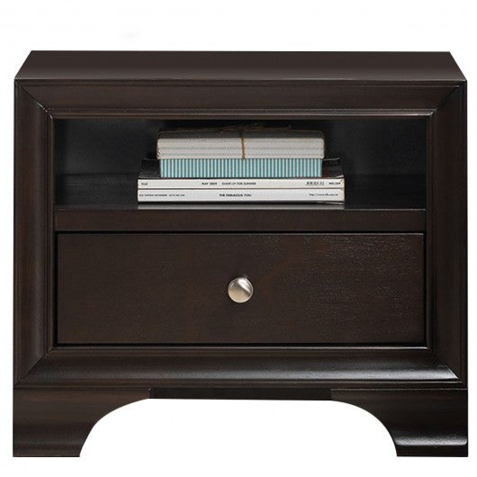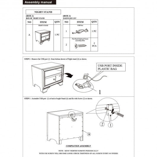 The nightstand is a simple and highly functional table with a spacious top and one drawers and a open cube to take care of all your storage needs. Furniture is square in shape and can easily be used as a bedroom bedside table nightstand or an accent end table in your living room. One drawer and one open cube design allows you to reduce clutter significantly. The lines of this end table are clean and uncluttered. This feature allows this table to be matched with any modern decor. The table top is spacious enough to keep a lamp a phone picture frames or a home decoration. In addition this nightstand equipped with security and practical USB charging dock which solve the phone charging problem when you only have usb data cable. If you want storage and style from your bedroom furniture please don't hesitate to buy this nightstand side table. Brand new and high quality Security and practical USB charging dock Simple design for modern room Durable and sturdy provide long-time service for you Versatile functional satisfy different needs Metal drawer slides for smooth gliding Can be set up in the bedroom or living room Featuring one drawer and one open cube ample storage space