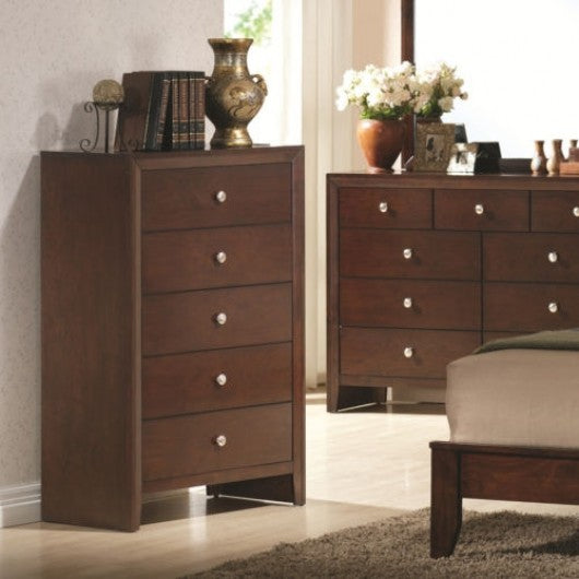 Update your bedroom or guest room furniture with this 5-drawer chest which will help you create a trendy and peaceful bedroom. Its rustic looking finish goes perfectly with the sleek modern appearance of this piece creating something original that will give your decor a superb effect. The five drawers slide easily on ball bearings and can be used to keep your clothes neat and organized while the top of this furnishing offers additional room for decorative objects. This drawer chest is available beautiful finishes to match any home decor. All you need to do is purchase this chest and enjoyment. Don't hesitate! Brand new and high quality 5-drawers chest made of MDF durable and solid with high weight capacity 5-drawer dresser has an elegant contemporary design Smart and stylish storage and organization solution for living room or bedroom Provides ample space for your storage needs No assembly is required