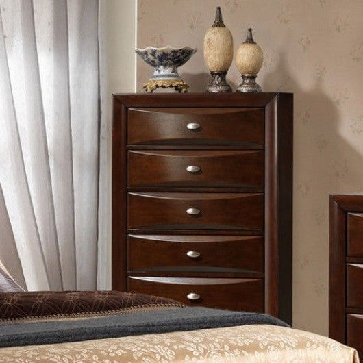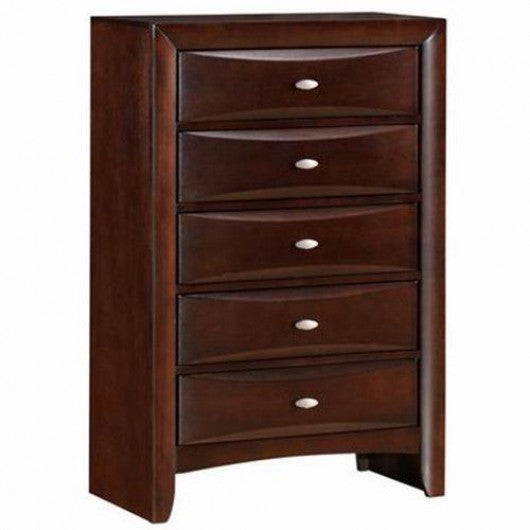 This is a great chest which will help you create a luxury and elegant bedroom. Its brown looking finish goes perfectly with the sleek elegant appearance of this piece creating something original that will give your decor a superb effect. Moreover featuring smooth surface and PU cover it can provide low-key luxury. The five drawers slide easily on bearings and can be used to keep your clothes neat and organized while the top of this furnishing offers additional room for decorative objects. Update your bedroom or guest room furniture with this 5-drawer chest. All you need to do is to purchase this chest and enjoy it. Brand new and high quality 5-drawers chest made of MDF durable and solid with high weight capacity 5-drawers dresser has an elegant contemporary design This drawer chest is available beautiful finishes to match any home decor Smart and stylish storage and organization solution for living room or bedroom Provides ample space for your storage needs No assembly is required