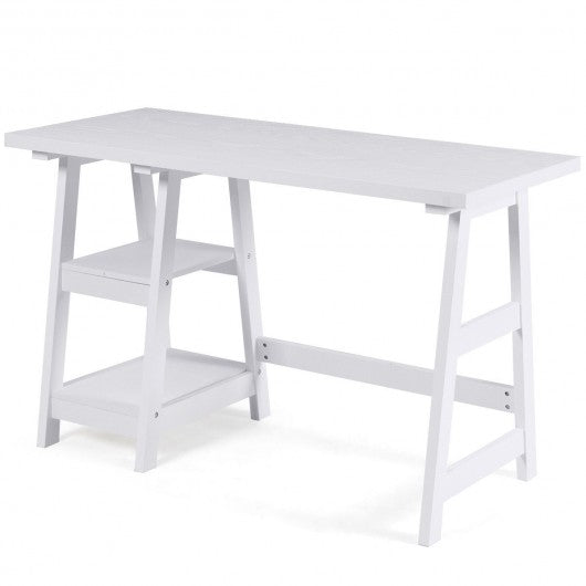 Modern Trestle Computer Desk Writing Laptop Table W/2 Open Tiers Shelves White-White