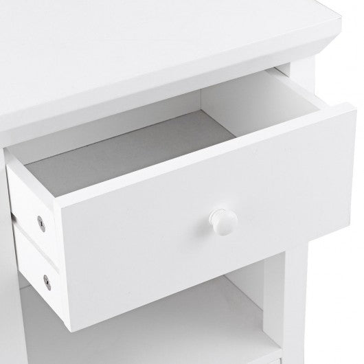 This bathroom cabinet combines style and functionality to create a modern home furnishing is ideal for use in bathroom bedroom and any space to store items. With white finish elegant and simple appearance this cabinet will well match with your furniture in your home. It can perfectly blend in various decoration styles and leave your guests a deep impression. Featuring a drawers one open cube and hidden cabinet area behind door this cabinet adds storage space to your room. It is ideal option for small bathroom. It has sufficient space to storing and organizing linens toiletries and bath essentials like soaps shampoos body wash and more. And the design of door not only to hide the item but also to keep moisture and dust out. This cabinet is made of thick MDF board with smooth paint waterproof and anti-corrosion which ensures durable and sturdy. So don't worry this bathroom cabinet can provide long time service for your family. Click and buy now! Brand new and high quality MDF board with white paint waterproof and anti-corrosion A drawer one open cube and one cabinet ample storage space Wipe-clean surface and easy to clean Large work surface up top for storage Perfect to fit your living room or bathroom Multi-usage suitable for many occasions Tidy and organized your room Assemble require