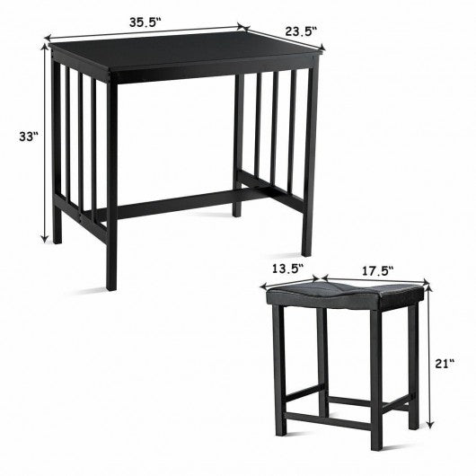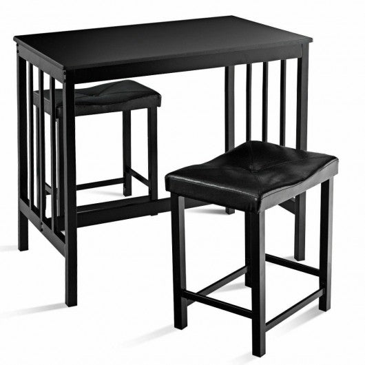The 3 Piece Counter Set with space saving convenience. This set features a simple rectangular table on long sturdy legs with two backless counter height stools with padded black PU seat covers. Featuring powder coated steel and MDF (medium density fiberboard) construction the rich dark finish adds an elegant touch that will blend with most decor styles. Perfect for a kitchen nook this durable and lovely set will help you make the most of smaller spaces! Brand new and high quality Modern And Upscale Furniture Sturdy And Durable For Years Of Use 3-piece set offers simplicity and versatility Perfect for smaller dining spaces Includes bar height table and 2 upholstered saddleback stools Stools tuck neatly under the table when not in use Some basic assembly required