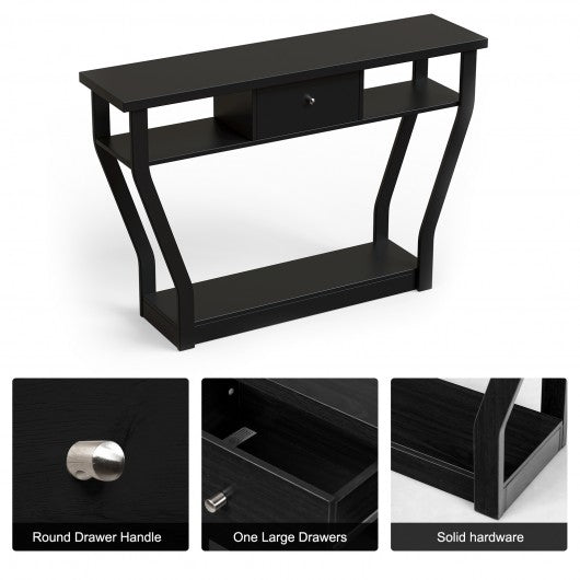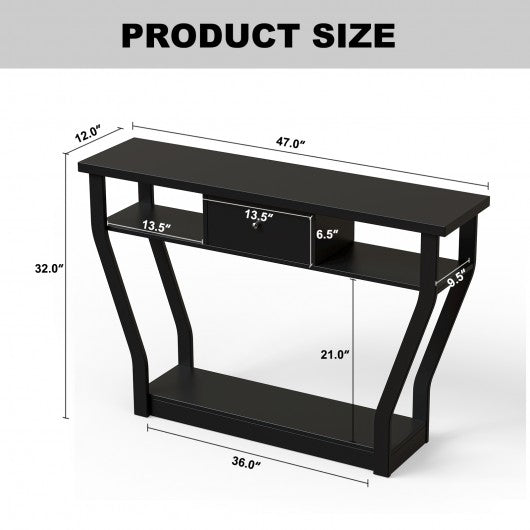 Give your guest a deep impressed! This console table is beauty and functional which mixes with modern and classical. So the console table can bring a different feeling to your home. The simple but practical console table features a drawer and open shelf making it convenient to display and store your things. On the top you can place your table lamp to read or your photo frames to decorate on the additional lower shelf you can place books magazines etc. It saves space and helps keep your room neat. Made of durable MDF with melamine is wear resistant and waterproof. This console table is hard enough to provide a lasting service. Plus the base in the bottom ensures it’s steady. And tilting prevention device ensure the safety in use. In addition this console table is easy to assemble under the easy -to -follow instruction. It is best option for you and your family! If you are looking for this product don't hesitate to place an order! Brand new and high quality console table 3 tiered shelf offers space to display the items or store the objects One extra drawer provides privacy storage space Unique outlook can complement with any home decor Concise and space saving design ensure the versatility Superior construction durable and sturdy Equipped with tilting prevention device for security Refined handle make it easy to open the drawer Simple to assemble with detailed instruction Smooth surface is easy to clean and maintain