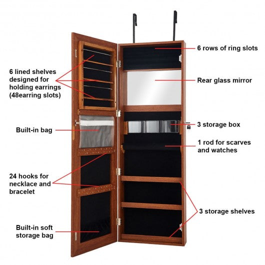 This is the mount jewelry is made of premium density board which ensure long time use. It is specially designed for all your valuables and it can keep your jewelry organized and prevent them from getting tangled. Once you open the cupboard your jewelry is clear at a glance. The days of spending and hours looking for your favorite earrings are gone. The cabinet comes completely with space for 6 lined shelves to hold earrings (include 48 earring slots) plus 24 hooks for necklace and bracelet and extra built-in bags for storage. Moreover this cabinet includes 6 rows of ring slots and 1 rod for scarves and watches. In addition you can screw it on the wall or attach the hooks hang over the door. Just do it as you like. And this cabinet is equipped with lockable keys which ensures the safety of your property. This practical and stylish jewelry armoire cabinet is an attractive artwork. If you are looking for such product don't hesitate to buy it now! Brand new and high quality Made of premium density board durable and stable Painting coated moisture and corrosion resistant Plenty storage space and keeps all the jewelry well organized Oxidation resisting velvet liner prevents your jewelries from being scuffed and scratched Helps your jewelry in an organized manner and prevents them from getting tangled Hang the jewelry organizer over the door with equipped hooks (3 different height available) or mount it on the wall with screws Equipped with lock (2 keys is included) which ensures the safety of your jewelry Full length outside mirror to provide you a whole vision for your appearance checking and doing makeup