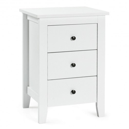 This three drawers nightstand end table has beautiful design and attractive shape. The pure white color can suit for almost any furniture styles and the size of this product is reasonable so you can put it an any place of your room like bedroom living room bathroom and so on. This accent table has super large storage space contains three drawers and one huge opening platform can be used for placing and collecting various items and you can classify and store different types of items for your next use and also makes your room clean and neat. Now you must worry about the quality of this product this three drawers nightstand end table is made of sturdy MDF board and particleboard this stylish end table will not be wiggle or squeak ensuring years of use. If you are looking for a nightstand don�t wait anymore come and buy it. Made of high quality MDF board and particleboard Have super large storage space can be used Suitable for all kinds of different rooms Beautiful appearance and nice-looking shape Drawers are equipped with handles for easy use Space-saving design allows this nightstand to fit into tight spaces A great addition to enhance home d�cor 3 sliding drawers to store different things