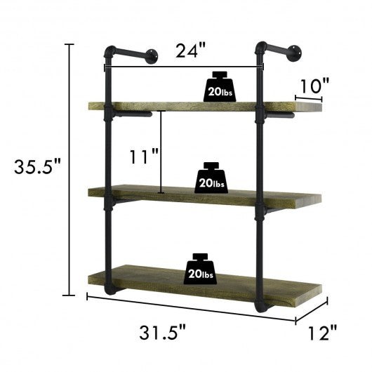 Specification: Material: MDF board metal pipe frame Color: Wood grain A Product dimensions: 31.5'' x 12'' x 24" (L x W x H) Package size: 34.5'' x 15.5'' x 7" (L x W x H) Net weight: 13 lbs Height between shelves: 11"( without adjustable) Board dimension:31.5'' x 10'' x 1.5" (L x W x H) Wight capacity of each shelf: 20 lbs Diameter of metal disc: 2.5'' Package includes: 1 x 2-Tier industrial pipe wall shelf 1 x Instruction B Product dimensions: 31.5'' x 12'' x 35.5" (L x W x H) Package size: 41.5'' x 15.5'' x 8" (L x W x H) Net weight: 19 lbs Height between shelves: 11" without adjustable Board dimension:31.5''x 10'' x 1.5" (L x W x H) Wight capacity of each shelf: 20 lbs Diameter of metal disc: 2.5'' Package includes: 1 x 3-Tier industrial pipe wall shelf 1 x Instruction