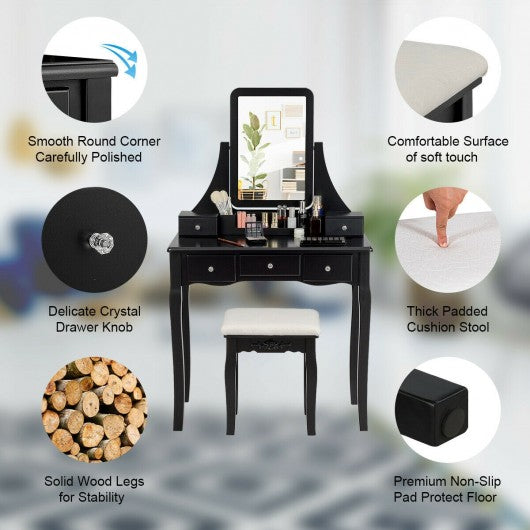 Give your morning routine a touch of modern elegance with this beautiful vanity table set! This is the modern and elegant vanity table which adds functionality to you because the 2 in 1 design. The vanity table has five drawers and a removable storage box to provide great storage space. One big drawer including 2 diy dividers to hold cosmetics jewelry brushes nail polish and more. The high-definition mirror can rotate 360 degree for better experience. The top is detachable and when it is removed you can get a writing table. This table is durable and stable because of the premium MDF material and sturdy pine legs. The cushion is thick and comfortable. If you are looking for the vanity table set Don't hesitate to buy one! Five drawers and one removable storage box 360-degree rotating hd mirror for checking the makeup look Detachable top for multi-function using 2 in 1 design for saving space and money 2 diy dividers Tilting preventing device Smooth surface is easy to clean and maintain Solid stool with thick cushion and exquisite pattern Durable and stable construction for long time using Modern and elegant design is suitable for home decoration Simple assembly neede