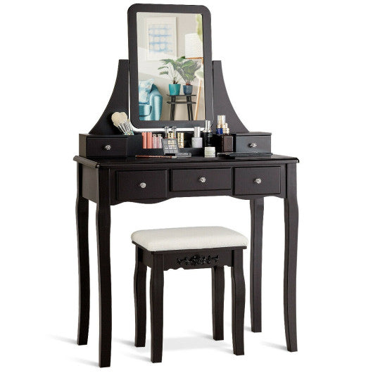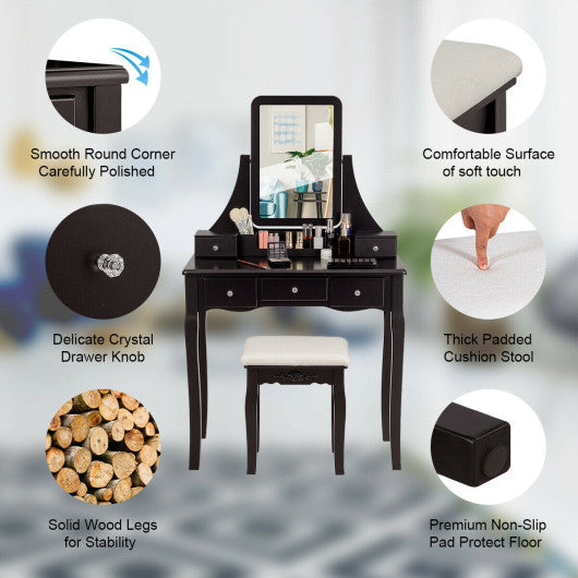 Give your morning routine a touch of modern elegance with this beautiful vanity table set! This is the modern and elegant vanity table which adds functionality to you because the 2 in 1 design. The vanity table has five drawers and a removable storage box to provide great storage space. One big drawer including 2 diy dividers to hold cosmetics jewelry brushes nail polish and more. The high-definition mirror can rotate 360 degree for better experience. The top is detachable and when it is removed you can get a writing table. This table is durable and stable because of the premium MDF material and sturdy pine legs. The cushion is thick and comfortable. If you are looking for the vanity table set Don't hesitate to buy one! Five drawers and one removable storage box 360-degree rotating hd mirror for checking the makeup look Detachable top for multi-function using 2 in 1 design for saving space and money 2 diy dividers Tilting preventing device Smooth surface is easy to clean and maintain Solid stool with thick cushion and exquisite pattern Durable and stable construction for long time using Modern and elegant design is suitable for home decoration Simple assembly neede