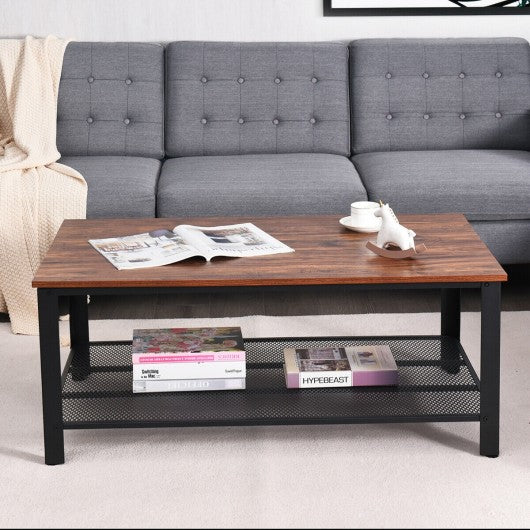 Metal Frame Wood Coffee Table Console Table with Storage Shelf-Brown