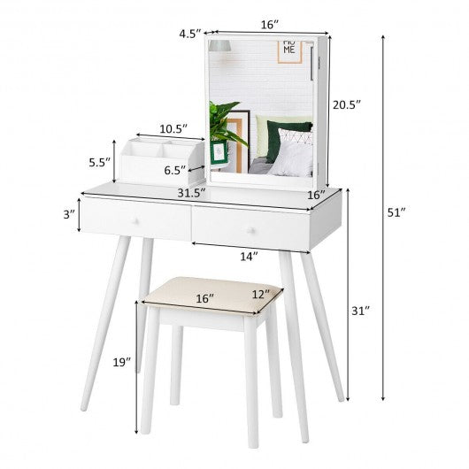 Specification: Color: White / black Material: MDF + Pine legs (stool legs) steel (table legs) Net weight: 45.5 lbs Product dimensions: 31.5" x 16" x 51" (L x W x H) Table top to the ground: 31 inches Stool size: 16" x 12" x 19" (L x W x H) Mirror cabinet size: 16" x 20.5" x 4.5" (L x W x H) Drawer interior dimensions: 13" x 11.5" x 2.5" (W x D x H) Weight capacity of table: 286 lbs Weight capacity of stool: 242 lbs Package includes: 1 x Dressing table 1 x Instruction manual