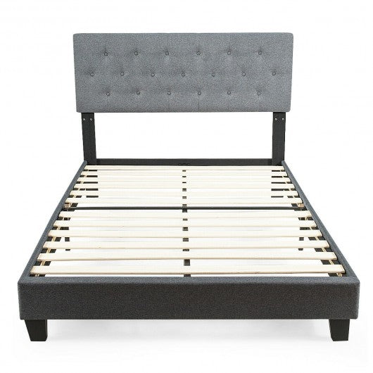Add attraction and elegant to any space with this full size platform bed. Featuring an rectangle tufted headboard with soft coves this bed is a beautiful and comfortable combination. And the unique and concise headboard and low -profit footboard make it be the perfect centerpiece for the bedroom However it not only pleasing the eye but comforting your body. Adopts durable steel and thick wooden slats this bed is durable and has enough weight capacity for you. Besides padded side rails are not only protect you but increase warm touch. If you are looking for it all you need to do is purchase this queen size bed and enjoyment after assembling. Have TSCA Certification Elegant rectangle headboard with tufted pattern Steel frame is durable and sturdy and not easy to wobble Quality structure ensures no abnormal noise 12 thick wooden slats provide comfortable and stable experience Padded side bed rails give your well protection Non-Slip adjustable feet protect your floor from scratching Supported by nine solid legs and does not wobble easily Quick to put together with clear instruction and hardware