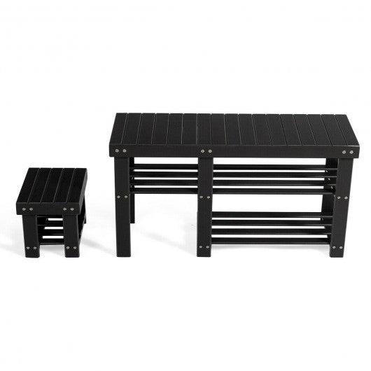 Specification: Color: Black Material: Bamboo Dimension of shoe bench: 34" x 11" x 18"(L x W xH) Dimension of stool: 11.5" x 8.5" x 9.5" (L x W xH) Load capacity of shoe bench: 264 lbs Load capacity of stool: 220 lbs Net weight:14 lbs Package include: 1 x Shoe bench 1 x Instructions