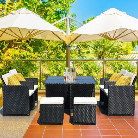 9 Pcs Patio Rattan Dining Set Chairs Ottoman Cushioned Glass Table Top