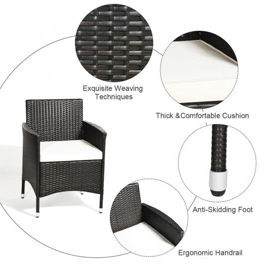 If you feel like taking a nap in the patio on a sunny warm afternoon with your family members or your friends. This outdoor wicker rattan furniture set can perfectly satisfy you. Featuring high quality rattan and sturdy steel this modern rattan furniture set has a long service life. Soft and thick cushion will provide you the most comfortable seating experience. Rattan construction is lightweight so it is easy for you to move them. Including 2 single sofas and 1 loveseat you will receive large seating area. The rattan coffee table is equipped with tempered glass which is thick and has large space. It is perfect for inviting guests to your home to have fun. The rattan set is an ideal solution for patio porch poolside and garden so you can enjoy the outdoor environment everywhere. Designed in modern and concise style this furniture set can perfectly match your patio or poolside decor. Just enjoy the leisure time with this 4 Pcs patio rattan furniture set! Weather-resistant rattan and steel frame for durability and stability Soft and thick cushion provide you comfortable seating experience(Pillows not included) Coffee table with tempered glass for strong supporting Armrest outward expansion for more ergonomic Both sofas and coffee table have high load-bearing capacity Lightweight rattan construction for easy moving and transport Stylish and concise design is suitable for both outdoor and indoor Ideal for placing in patio porch poolside or garden Easy to clean and maintain with a duster cloth Simple assemble needed with detailed instruction