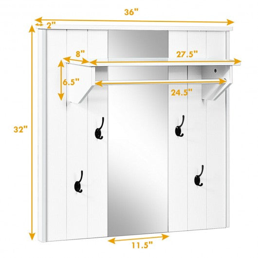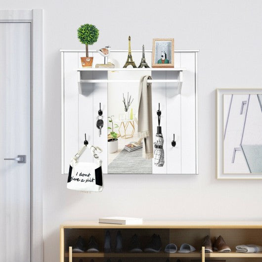 If you always forget to take keys or are tiered with the messy entryway then the entryway coat rack with hooks and storage shelves will be a perfect solution to your problem. You can put easy-to-forget keys on the sturdy hooks place sweet flowers on the upper shelf and hang cloth on the thick pine bar to maximum the utilization of both wall-mounted storage organization and the space of entryway. Safe as well as durable P2 MDF material will provide you secure service for a long time. Checking your appearance carefully in the front of the mirror is another advantage the storage shelf brings to you. Tidy environment in the entryway will give you a good mood when you going out and enter the home. If you are looking for an entryway coat rack don't hesitate to buy one now! The large mirror is convenient for checking appearance in the entryway 4 Hooks with solid construction allows for placing different items Each hook has 2 hanging methods and can withstand lbs Upper storage shelf provides additional spacious space Cloth Bar crafted with pinewood is sturdy to hang clothes The wall-mounted design is space-saving to keep a tidy environment P2 MDF is durable and safer for reliable usage The smooth white finished surface is beautiful and easy-to-clean Stylish appearance brings a good spirit to host