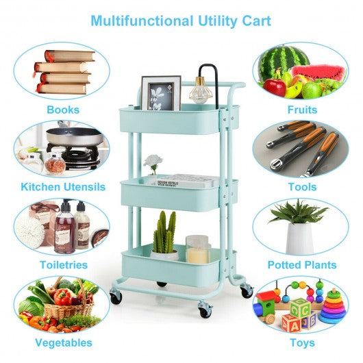 3-Tier Metal Rolling Storage Cart Trolley 2 Brakes with Handle-Green