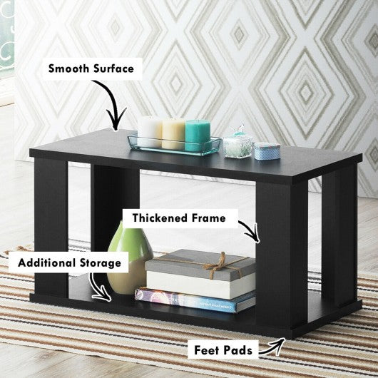 The rectangular rustic vintage coffee table with double storage space is a perfect choice for your living room study or office. Traditional European stylistic nobleness and elegance will highlight your unique taste. Dark black color fits well with those who have steady individuality or like elegant residential decoration. Thickened engineered wood and MDF ensure excellent sturdiness. Completely touched with ground the floor standing construction possesses better stability than other coffee table. And you can place the remote controller magazines coffee set compote and other household items on the wide tabletop and bottom open shelf at your will. If you are looking for rectangular rustic vintage coffee table don't hesitate to buy one. Spacious tabletop can hold remote controller compote coffee set vase etc Bottom open shelf provide additional storage space Durable engineered wood and MDF will not deform easily Sturdy construction with 4 thick supporters enhance the stability Chic and stylish looking perfect for living room office cafe Unique design with stable color fits well with home decoration Simple installation procedures take less effort and time Smooth surface easy to clean and maintain Feet pads can protect floor and reduce noise