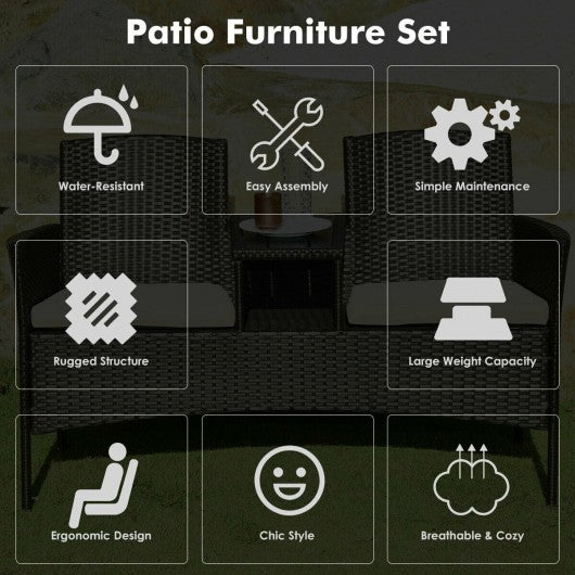 Enjoy outdoor leisure time with this patio conversation set. Featuring rugged structure and high-quality PE rattan this patio furniture set is built to stand up to harsh weather conditions and great for outdoor using. In addition this patio loveseat set comes with a coffee table between 2 seats that provide enough space for books and cups. And this patio loveseat sofa set is more practical than traditional loveseat sofa and more space-saving than 3-piece patio furniture set. Besides wide armrest and curved backrest ensures you will love the comfortable feel of the patio conversation. The thickly cushioned patio sofa set chairs for maximum comfort and excellent seating experience. By the way this conversation is easy assembly. If you are looking for this product don't hesitate to place an order! Made of high quality rattan with strong built-in frame structure Poly table top is durable and safe to use Trapezoid coffee table between two seats is practical Cozy thick cushions double your comfy The cushion cover with zipper is removable and washable Wide armrest and high curved backrest give you good support Non-slip stable feet prevent scratching the floor Modern style of unique design decor your room Easy to assemble with instruction