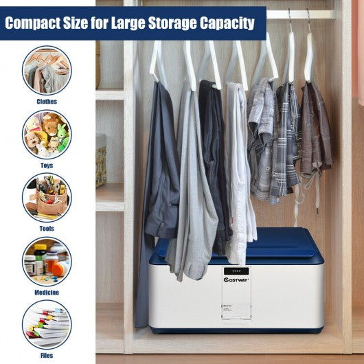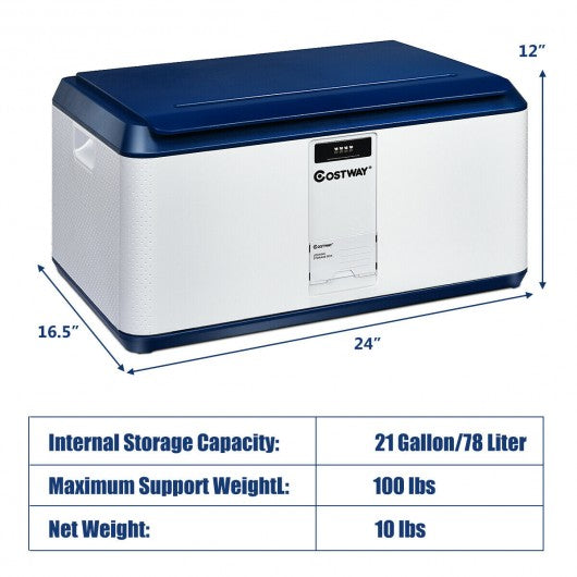 Specification: Color: White + blue Material: ABS Overall dimension: 24" x 16.5" x 12" (L x W x H) Net weight: 10 lbs Storage capacity: 21 gallon Weight capacity: 100 lbs Package includes: 1 x Lockable storage box 1 x User manual