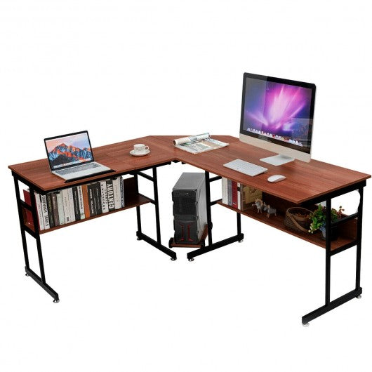 Good classification for working and relaxing area makes this desk become the main activity center of your home. This corner table fits snugly in a corner to save much space. The L-shape desk can be divided into two separate tables to meet your various needs. The tilted panel can be adjusted to an proper angle which will protect your eyesight and actively cooperate with you to work. 2 open shelves offer plenty of storage room for putting books files and other office essentials. Adjustable non-slip foot pads can prevent slipping to provide great stability. Have a computer table fits for you like this! Don't hesitate to buy it. L-shape desk to fit to any corner of your home Separable design to split into 2 tables Constructed of engineered wood and metal frame to ensure sturdiness and durability Adjustable tilting panel to find perfect drawing angle 2 open bookshelves for additional storage space Provides ample legroom for stretching your legs freely Max weight capacity can reach 450 lbs Knob beside the tilted desktop to fix the iron pipe Adjustable foot pads to keep the table stable