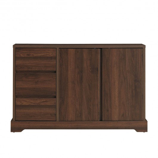 The multifunctional buffet sideboard is ideal to arrange your dining essentials and tableware. Except for that it also serves to display your plants photo frames and store your items in living room and bedroom. Equipped with 3 drawers and 1 cabinet the console table can effectively keep your household items in good order. Besides sturdy and stable structure ensures that it can hold them safely. The pads at the bottom not only provide stability but also prevent floor scratching. It is worth mentioning that the notched handle design help you open drawers and cabinets easily. Made of P2 standard MDF Board and particle board it is both environmental friendly and durable. Featuring beautiful wood grain and mid-century style this buffet sideboard can perfectly fit your rooms� style and furniture. If you are looking for it don't hesitate to buy it! Wide application serve as not only buffet cabinet but also storage cabinet for your living room and bedroom Large storage space with a spacious top area 3 drawers and 2 cabinets to keep your household items in order Made of P2 standard MDF Board and particle board environmental friendly and durable Stable and sturdy structure with large bearing capacity Laminated board has natural and beautiful wood grain and is easy to clean Notched handle design for easy opening Mid-century style fitting any decor of your rooms Safety anti-toppling fitting The cabinet with a shelf it has 3 height to adjust meet your different needs