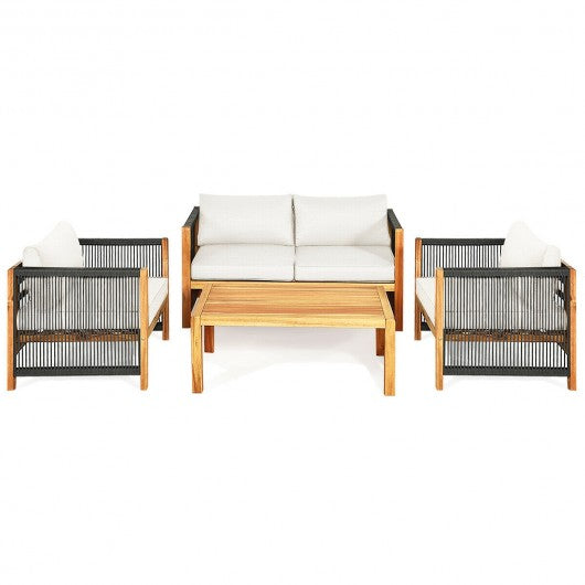 4 Pcs Acacia Wood Outdoor Patio Furniture Set with Cushions-White