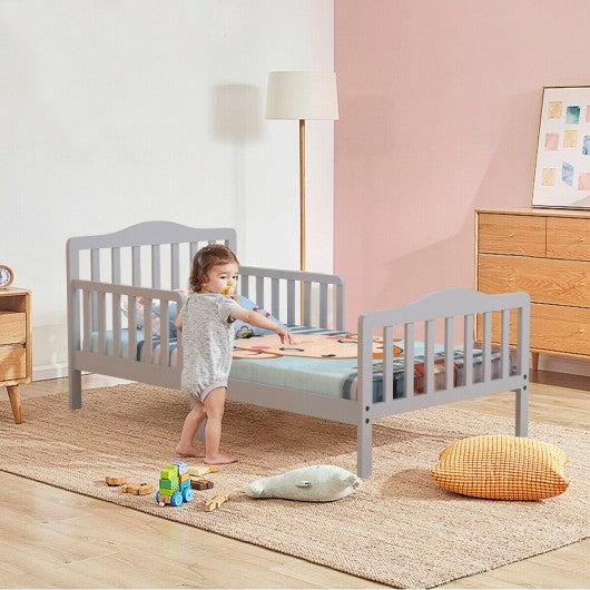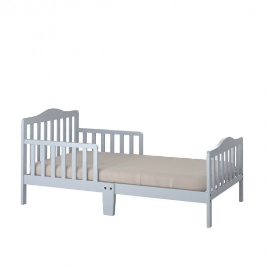 This classic toddler bed with guardrails will be the perfect present for your adorable little one! Designed with guardrails on both sides this toddler bed with ASTM certification offers the best protection for your kid. This classic design toddler bed comes with no odor and round edge design which prevent your kid from accidental injury. Made of solid rubber and poplar wood this kid bed is durable and stable to hold up to 50 lbs. And it will be the eye-catching addition to your home decor. If you are looking for such toddler bed don't hesitate to buy it! Premium rubber and polar wood 50 lbs load-bearing capacity Thick bed wood slat distribute more even force Low to the ground-5.5 inches convenient for climbing up or down Safe guardrails on both sides won't fall off accidentally Fits full size crib mattress-51.5" x 27.5" in dimensions (mattress bedding and pillow not included) Classic style complements any home d�cor Great gift to your kids for sweet dream Recommend ages over 15 months to develop their independence Passed ASTM certification safety assured Easy Assembly