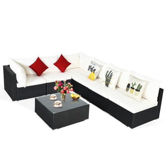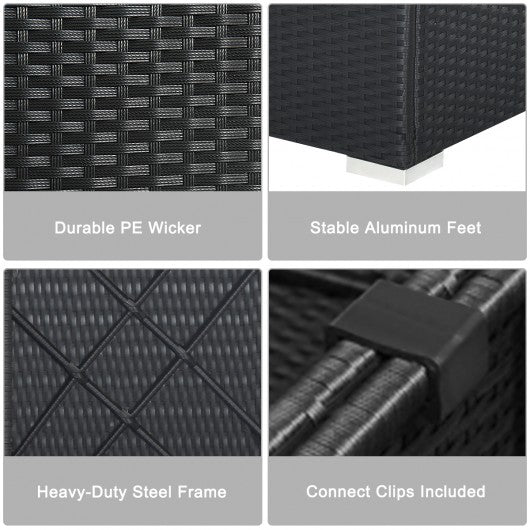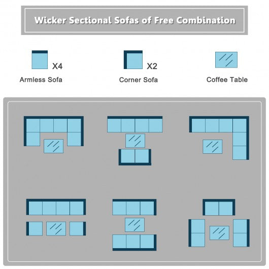 This premium 7-piece patio furniture set comes with 4 armless sofas 2 corner sofas and a coffee table. Made of superior steel and water-proof PE rattan the patio furniture set has a long lifetime as well as large weight capacity. Besides thick seat cushions back cushions and pillows for extra cozy. Besides the seat cushions have removable and washable cover for easy cleaning. Coffee table with tempered glass top is durable and functional. It is a great additional to your patio garden backyard pool and other space don't hesitate to buy it. Free combination of sectional sofa as per your needs Solid structure with L shape aluminum feet Exquisite PE wicker frame adds unique charm Comfortable sofa set with thick cushions and soft pillows The cover of seat cushion is removable and washable Functional coffee table has tempered glass top Clips to keep sofa set firmly together Unique and chic style suitable for garden poolside and balcony Easy to assemble and simple maintain