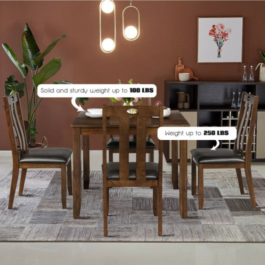 Specification: Color: Brown Material: Acacia wood rubber wood MDF PVC Net weight: 106 lbs Table size: 36" x 36" x 30" ( L x W x H ) Chair size: 18" x 20" x 38" ( L x W x H ) Table weight capacity: 100 lbs Chair weight capacity: 250 lbs Package include: 1 x Table 4 x Chairs